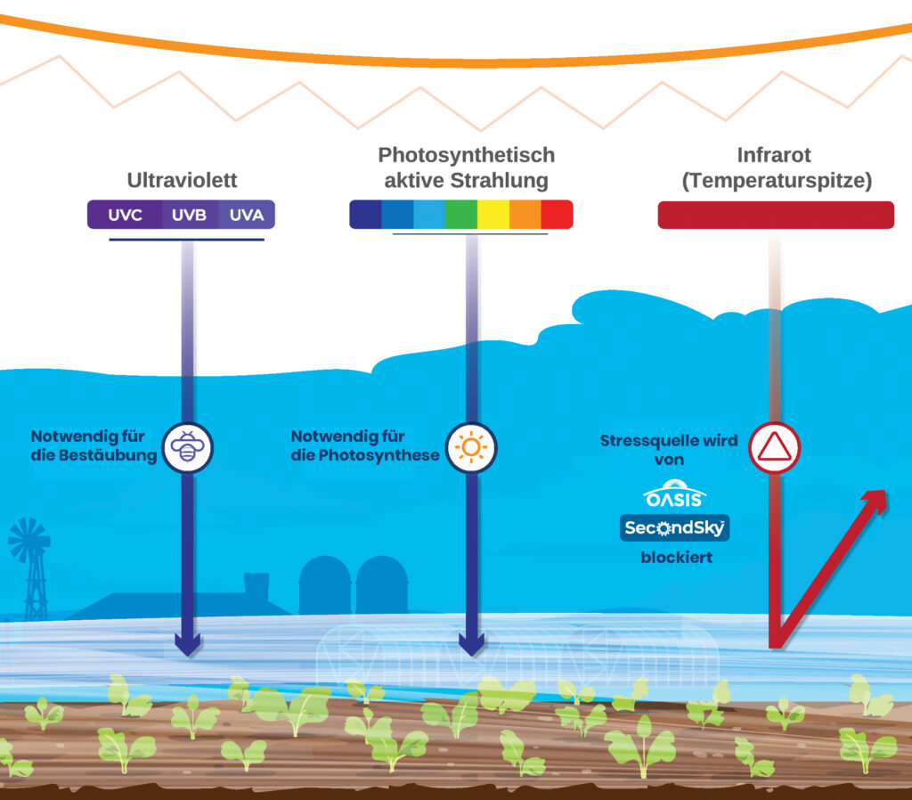 OASIS SecondSky™ Folien blockieren Temperaturspitzen und reduzieren effektiv die NIR (Nah-Infrarote Strahlung), während sie gleichzeitig Licht/PAR (photosynthetisch aktive Strahlung) zu den Pflanzen durchlassen. Diese innovative Technologie hilft, den durch übermäßige Hitze verursachten Pflanzenstress zu verringern und unterstützt stabilere, optimierte Wachstumsbedingungen in allen Kulturen.